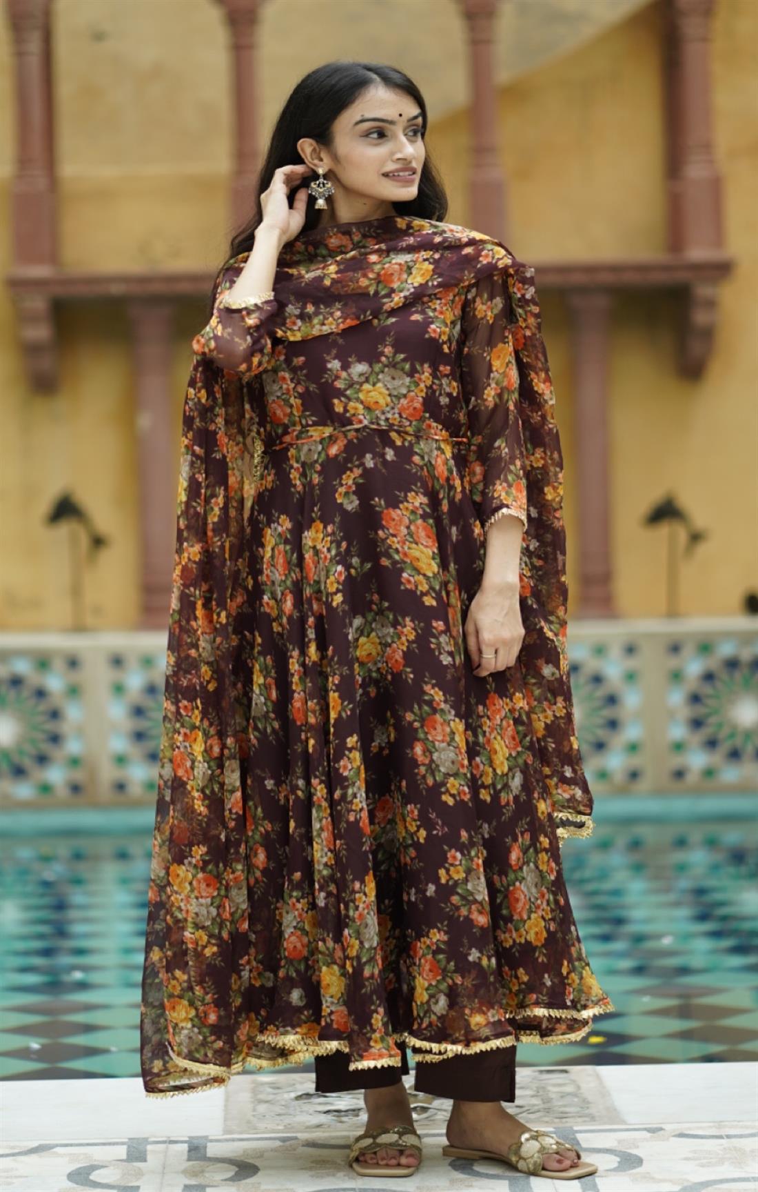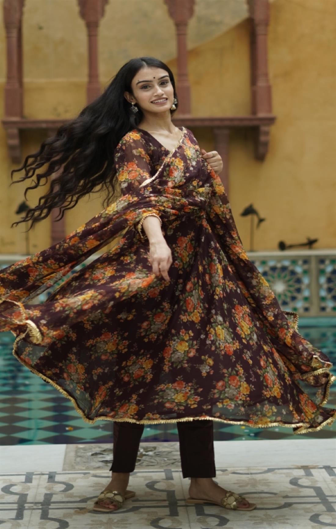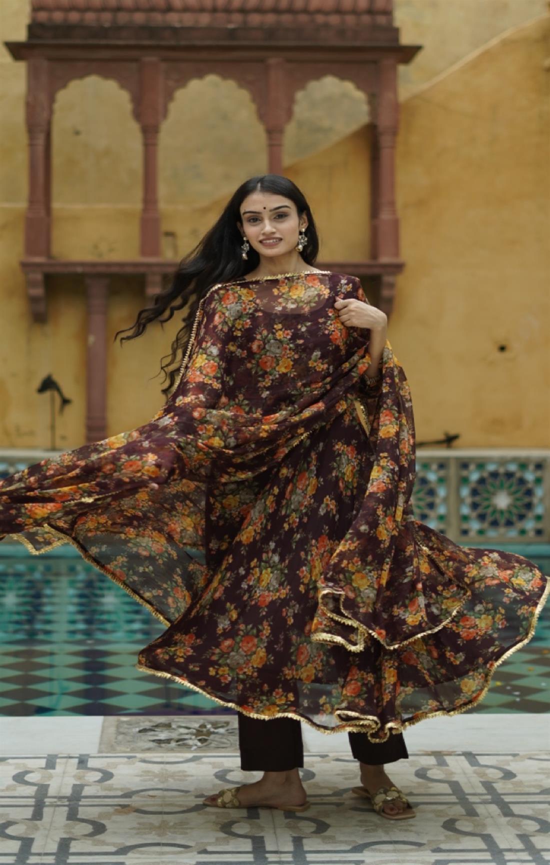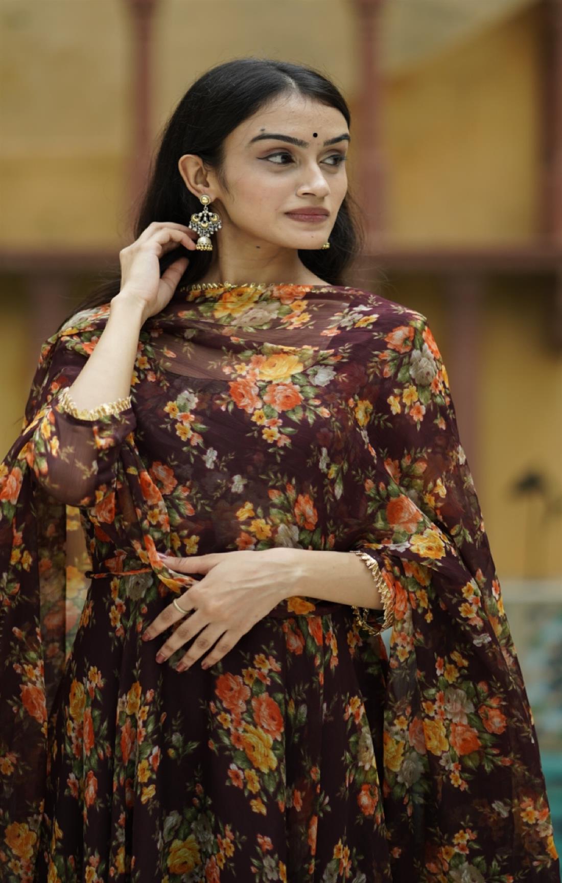 BROWN FLORAL CHIFFON SUIT SET
